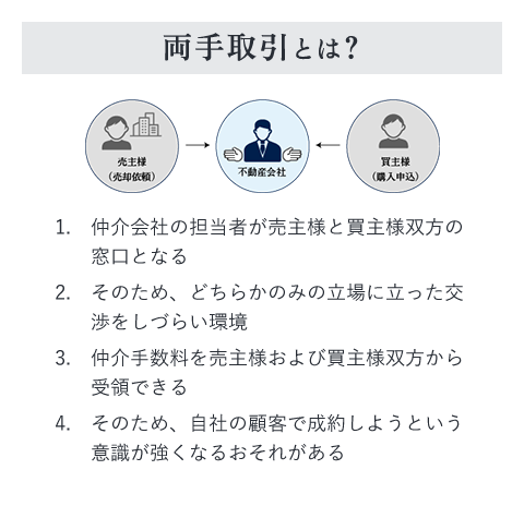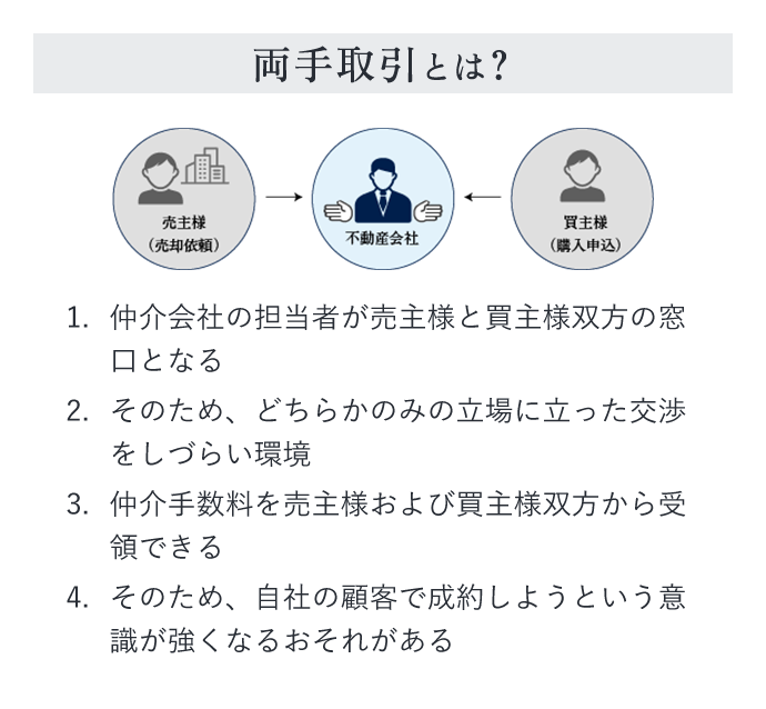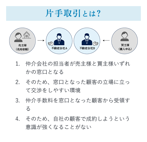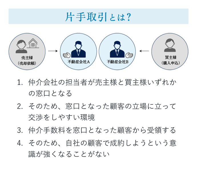 売主様・買主様双方に対し同一の担当者がお手伝いすることを「両手取引」といい、売主様・買主様を、それぞれ異なる担当者(エージェント)がお手伝いすることを「片手取引」といいます。不動産先進国といわれている米国などでは、片手取引が標準的です。
